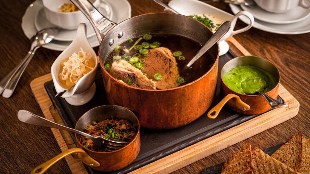 Klasszikus marhahúsleves, benne prémium minőségű főtt marhahús, velőscsont és gyökérzöldségek. Hozzá pirítós, tejszínes spenót, pirított burgonya “rösti” metélőhagyma mártás és almás torma.